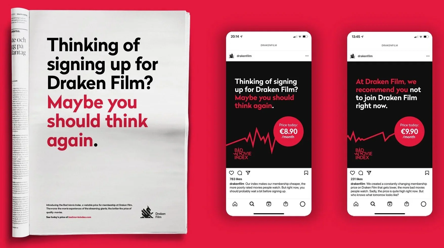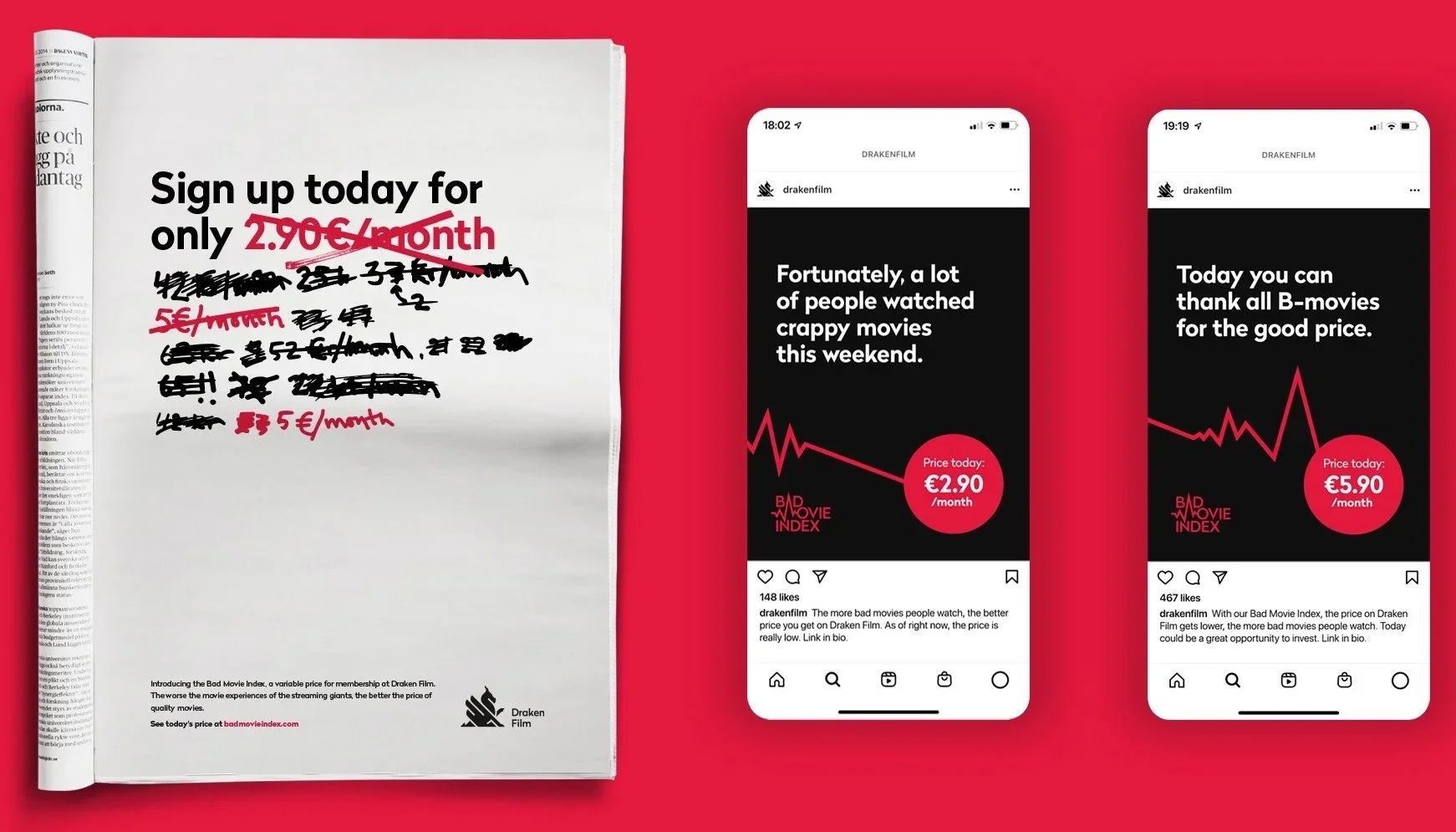 We created the The Bad Movie Index – a constantly changing membership price that gets lower, the more bad movies people watch on the big platforms. This idea not only generated awareness for Draken, but also created a completely new business model in the streaming market.
